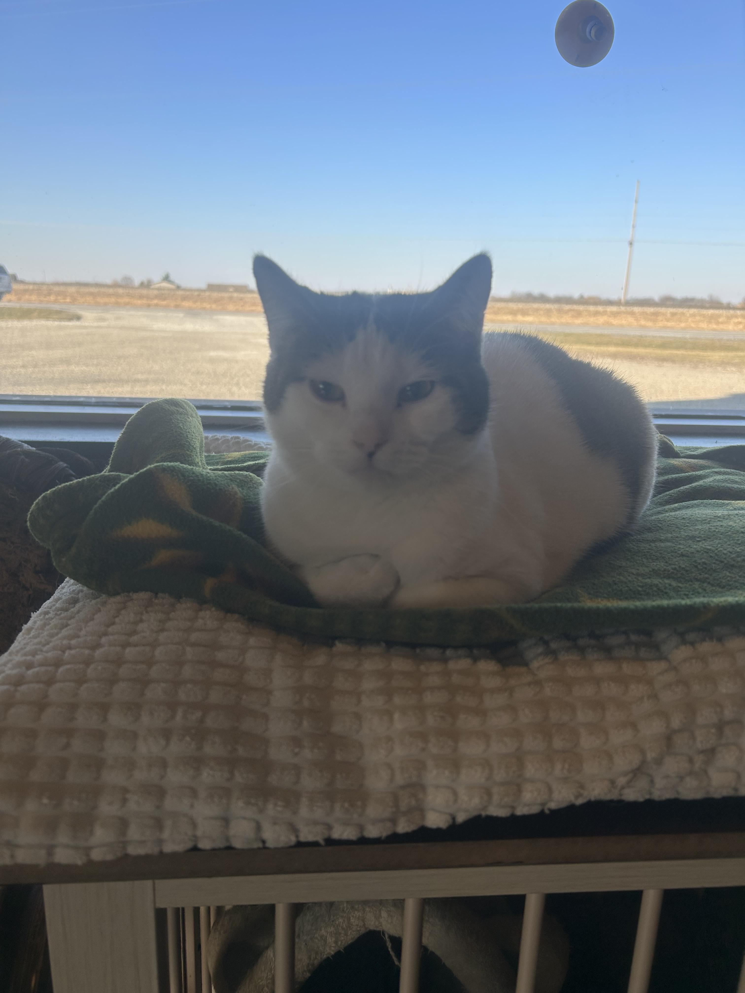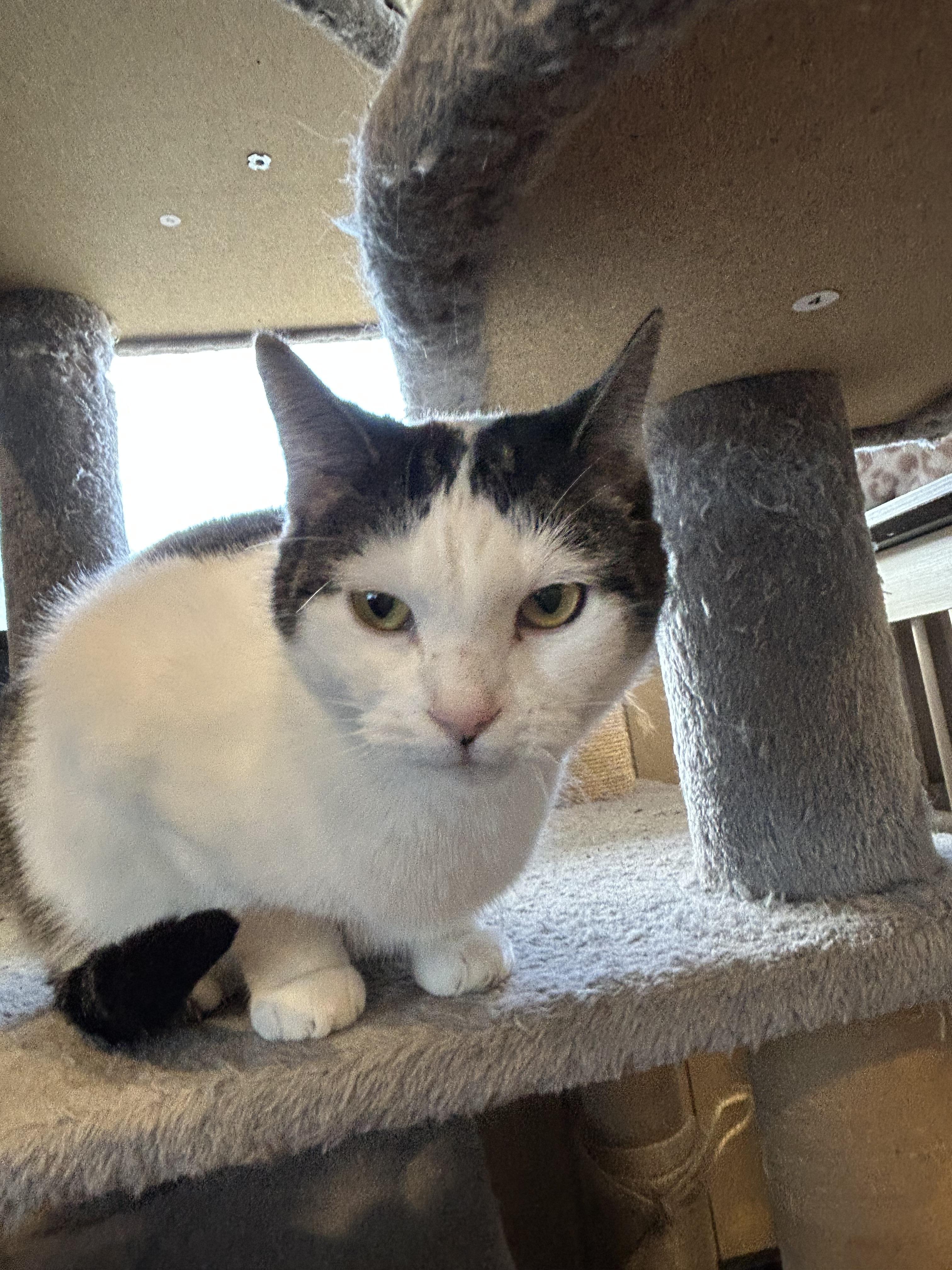 Our shy girl has spent most of her time hiding, but lately she’s been brave enough to come out while people are around. 💜 She’s not quite a lap cat yet, but with patience and love, we know she’ll show her true colors.