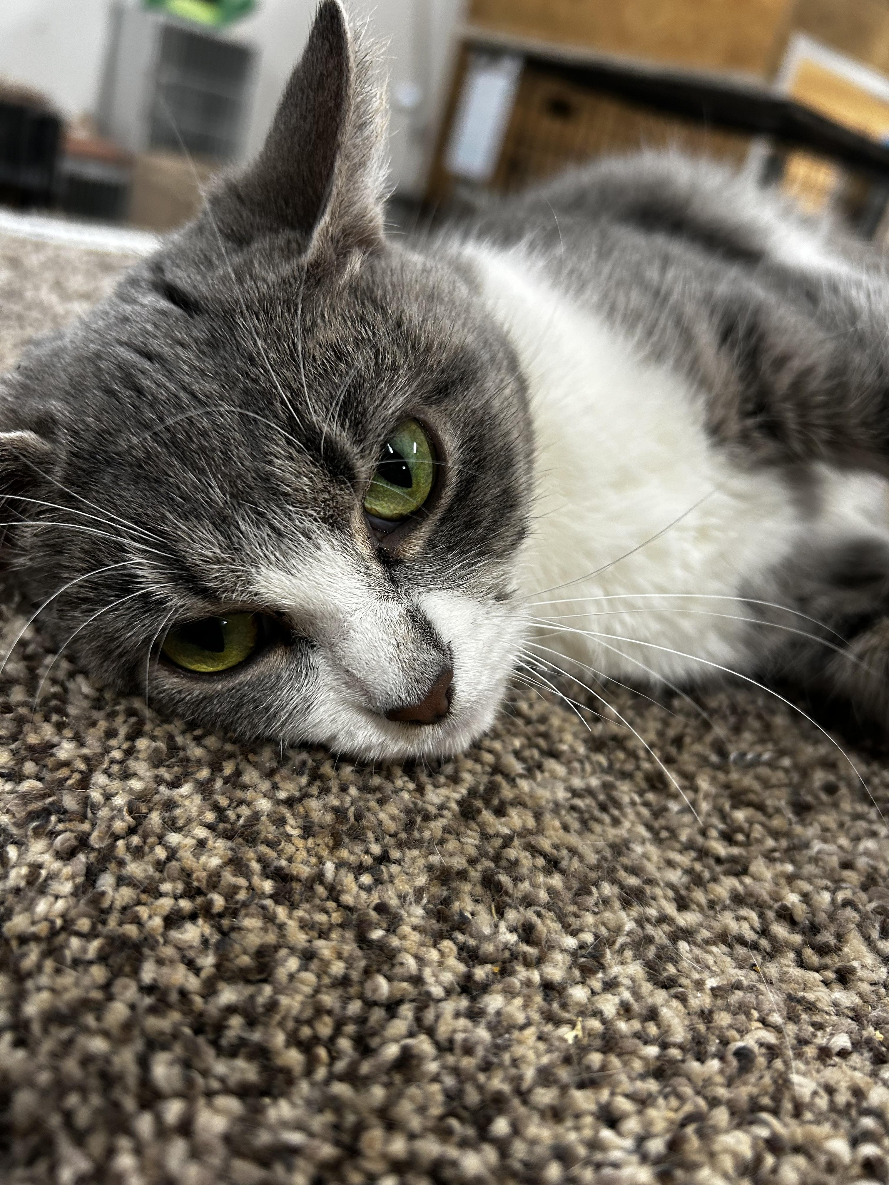 She has claimed her special place and monitors everyone who comes into the Cattery to get her approval! Not a difficult achievement as her adorable green eyes and heart-shaped nose steal the show. Come and meet this beautiful not to mention soft and cuddly kitty at the Cattery.