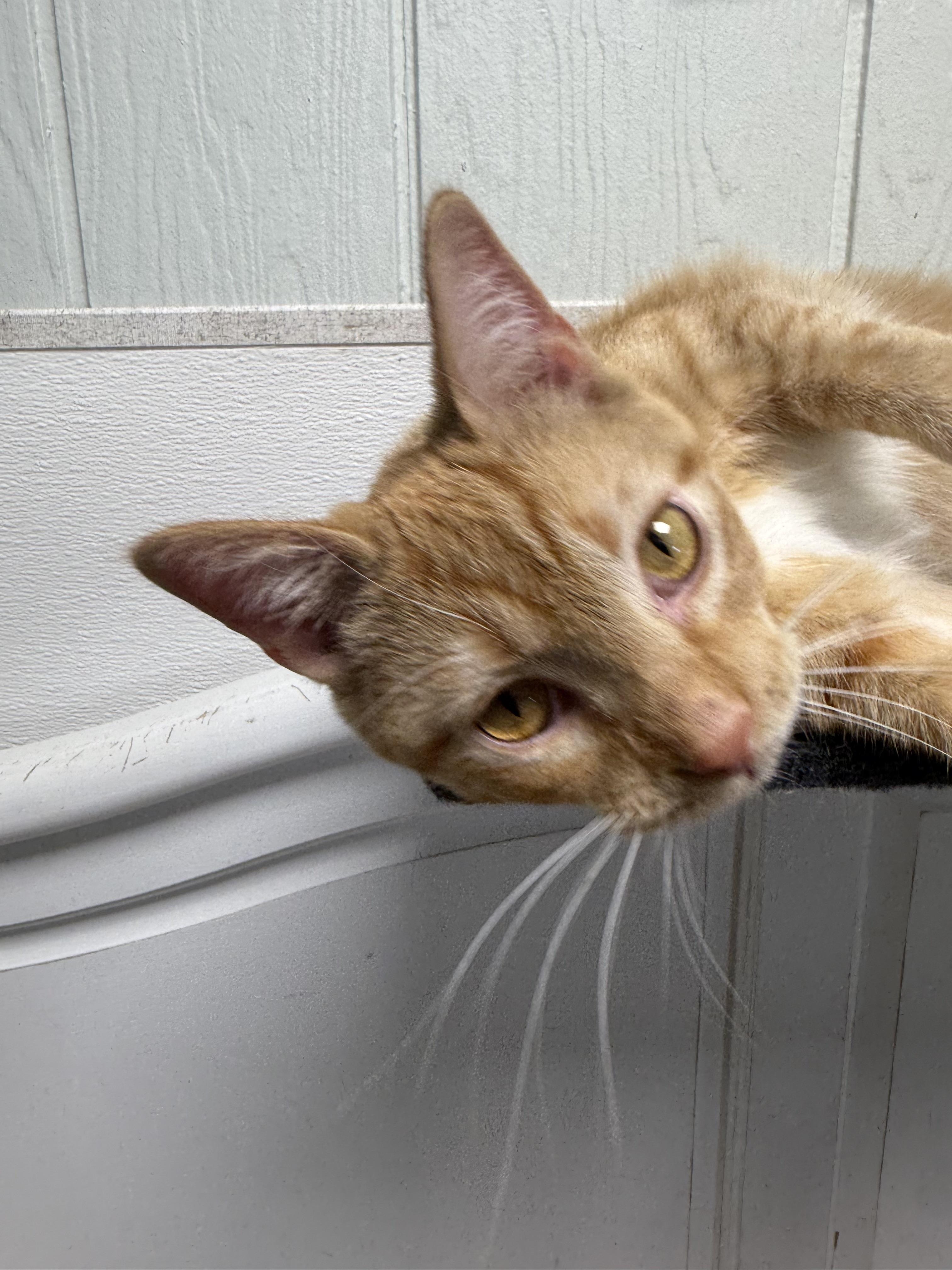This cute fella is Georgie, the orange whirlwind of fun at our shelter! This playful and spirited tabby loves hard and plays harder, bringing endless energy to every moment. With a knack for finding mischief, Georgie keeps life exciting—whether he's chasing toys or plotting his next adventure. It's never a dull day with Georgie boy around!